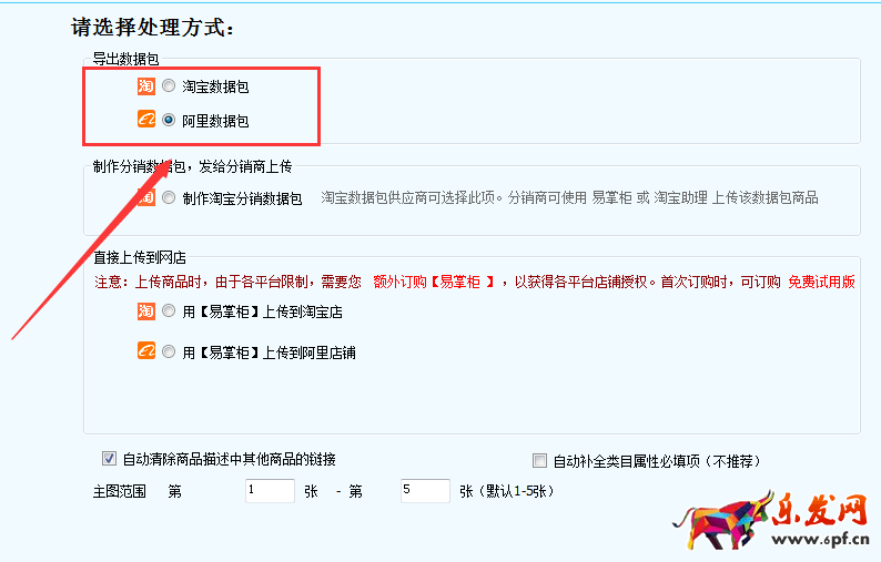 4.選擇處理方式,因為我是導入的淘寶數據包,這邊導出選擇的是阿里數據包,如果你需要發給分銷商,也可以選擇制作淘寶分銷數據包。