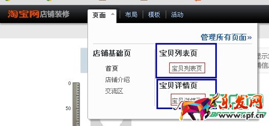 進入裝修首頁面后,在店鋪的左上方“淘寶網店鋪裝修”的黑色導航上。點頁面會彈出下拉的菜單。下拉后會看見右邊有一個“管理所有頁面”點進去。