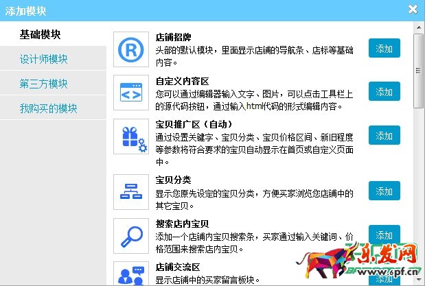 點添加后!設計師模塊和基礎模塊都可以自己添加。如果做自定義的話!就是在基礎模塊里面哦!