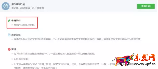 很多在埋頭原創(chuàng)的公眾號(hào)問得最多的就是這個(gè)問題了,但目前原創(chuàng)聲明功能仍處于內(nèi)測(cè)階段,真的只能由官方邀請(qǐng)開通。后臺(tái)功能申請(qǐng)條件里只有“發(fā)布的文章堅(jiān)持原創(chuàng)”簡(jiǎn)單九個(gè)字。
