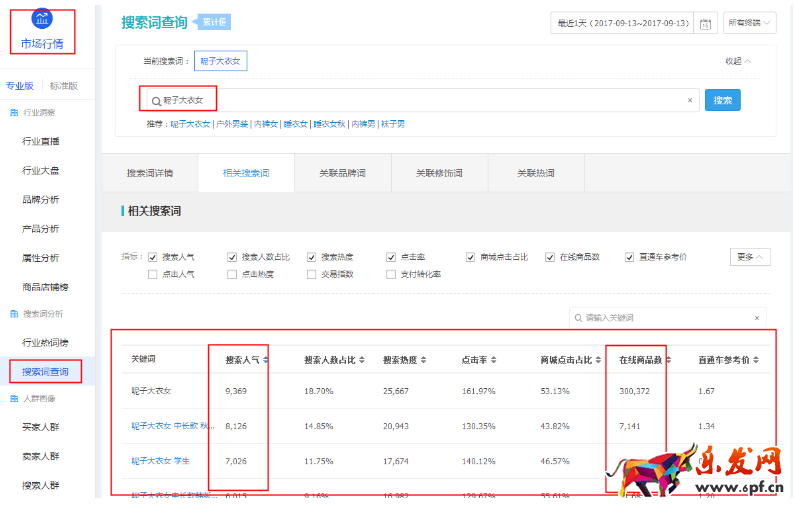搜索詞查詢:這個定制了生意參謀市場行情標準版或者專業版的小伙伴們才能用。我們點擊搜索詞查詢,輸入我們的核心詞,系統會根據核心詞匹配500個相關搜索詞,我們篩選這些詞的原理是:搜索熱度持續增長、在線寶貝數少、寶貝屬性符合、相關性好等,將這些詞記錄到excell表格。市場行情是我們用的最多的找詞工具,時效性、精準度、詞的信息都比較好,也是我們運營店鋪的必備工具之一。