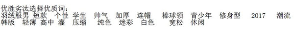 首先將在生意參謀中數(shù)據(jù)表現(xiàn)較為優(yōu)秀的詞選出來(lái),都放到一個(gè)TXT文檔當(dāng)中,一行一個(gè)標(biāo)題,這樣可以非常清晰的看到并篩選出我們需要的詞。像是男裝羽絨服,找到的關(guān)鍵詞有這些: