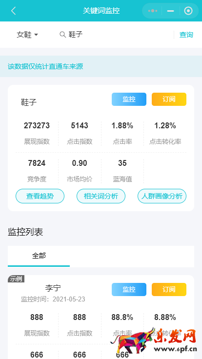點(diǎn)擊關(guān)鍵詞監(jiān)控,可以查詢?nèi)我怅P(guān)鍵詞的展現(xiàn)指數(shù)、點(diǎn)擊指數(shù)、點(diǎn)擊率、轉(zhuǎn)化率、競(jìng)爭(zhēng)度等詳細(xì)數(shù)據(jù),并且能查詢到這個(gè)關(guān)鍵詞下的相關(guān)搜索詞,方便我們拓展關(guān)鍵詞去優(yōu)化標(biāo)題和投放直通車。