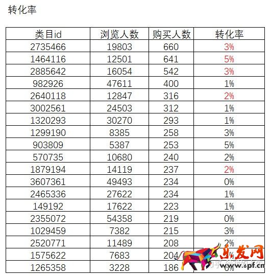 轉化率:從第4名-第7名類目轉化率低,只有1%-2%,但瀏覽人數排名靠前,說明這部分產品推薦規則不準確,導致大量曝光,增加點擊,但未完成轉化