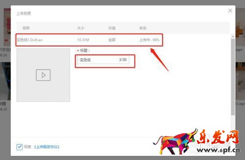 7、上傳視頻對話框會顯示上傳名稱、大小、分組、狀態,可以實時看到上傳進度。