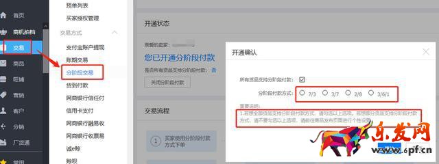 開通路徑:阿里后臺 - 交易 - 交易方式 - 分階段交易