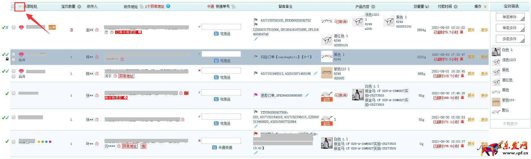 四、在“批量打印 - 買家旺旺”篩選“僅選中可達訂單”進行打單發貨,不可達訂單有“×”打標,不可達訂單點擊“掛起”按鈕,進行掛起操作。