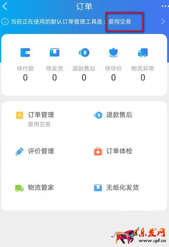 5、如圖所示,訂單界面就會提示“當前正在使用默認訂單管理工具是:愛用交易”。
