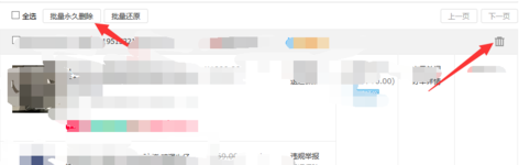 5、確認(rèn)選中需要徹底刪除的訂單信息后,點(diǎn)擊“全選”框邊上的“批量永久刪除”。