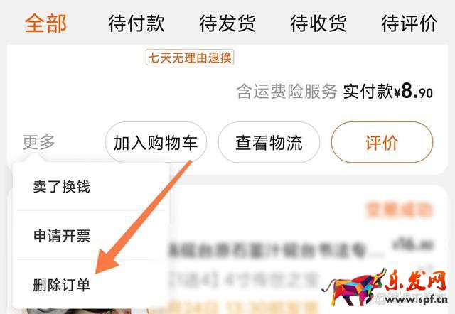 總結:手機淘寶—我的淘寶—我的訂單(全部)—更多—刪除訂單