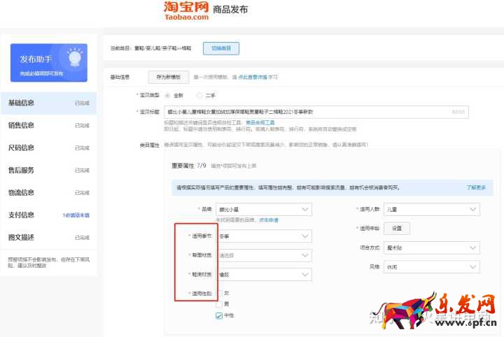 在這個淘寶網商品發布頁面,注意我下圖紅色框柱的地方,只要旁邊帶有紅色星號的都是必填項,只有填完整了,才能成功發布。如果有些信息不清楚怎么填,可以返回到1688該產品頁面看下商品屬性或者在淘寶上去搜索一下同款產品,看下同款產品的詳情頁屬性。