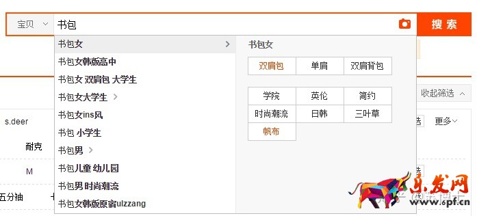 搜索框選詞:搜索框搜索關鍵詞,系統會匹配相應的關鍵詞。比如我搜“書包”,系統會自動出現一堆相關關鍵詞。