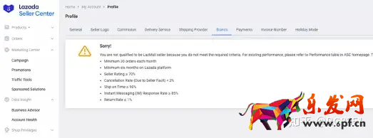 2.如果您點(diǎn)擊“Brand ”出現(xiàn)以下頁面,則表示你的賬戶表現(xiàn)暫時不符合入駐Lazmall.
