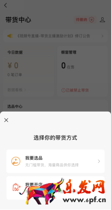 6、選擇你要帶貨的方式,自己有貨,就選擇“我要開店”;自己沒有貨,就選擇“我要選品”,選品中心是去平臺選商品,找到自己想要賣的貨品,點擊“加櫥窗”即可,這樣就自動開通了視頻號的櫥窗功能。
