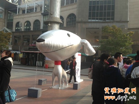 巨鐘下邊的人群,原來正在圍觀 京東 的雙十一促銷的預熱推廣。場地中央也是鐘表的圓圈,裝扮好的 京東 吉祥物JOY狗邀請路人上來,一起玩“追趕”游戲,追上JOY狗,參與的觀眾就有獎品拿。可能是JOY狗太萌太熱情了,現場真有不少大媽、小孩相繼上去做游戲。